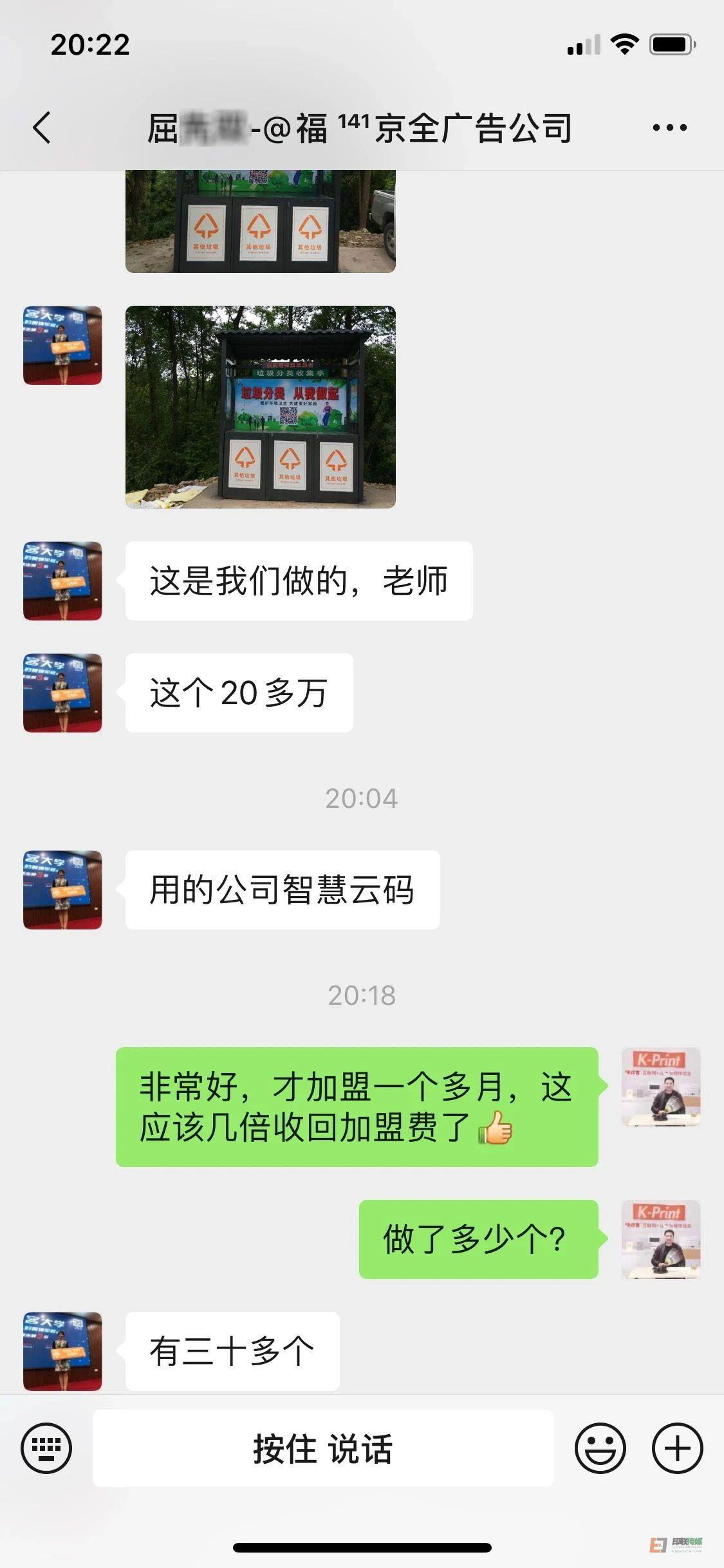 覃總超強的執(zhí)行力,讓京全廣告加盟快印客才一個月,便幾倍收回了加盟費。因為,光智慧垃圾分類解決方案,就為京全廣告帶來20多萬的收益! 隨著疫情的逐漸好轉(zhuǎn),京全廣告的所在地——張家界市武陵源區(qū)準備將垃圾分類進行落地,打造一批垃圾分類收集亭。覃總主動向區(qū)領導推薦了快印客的“互聯(lián)網(wǎng)+”模式和智慧云碼技術系統(tǒng),得到領導的認可。