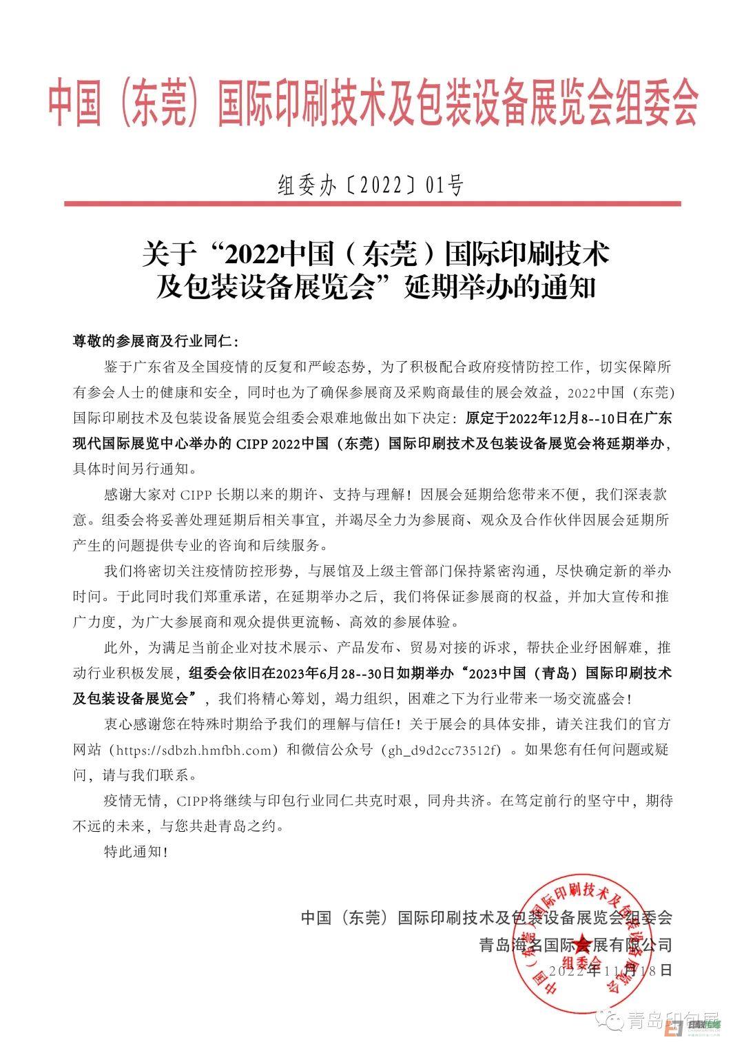 鑒于廣東省及全國疫情的反復(fù)和嚴峻態(tài)勢,為了積極配合政府疫情防控工作,切實保障所有參會人士的健康和安全,同時也為了確保參展商及采購商最佳的展會效益,2022中國(東莞)國際印刷技術(shù)及包裝設(shè)備展覽會組委會艱難地做出如下決定:原定于2022年12月8-10日在廣東現(xiàn)代國際展覽中心舉辦的CIPP 2022中國(東莞)國際印刷技術(shù)及包裝設(shè)備展覽會延期舉辦,具體時間另行通知。